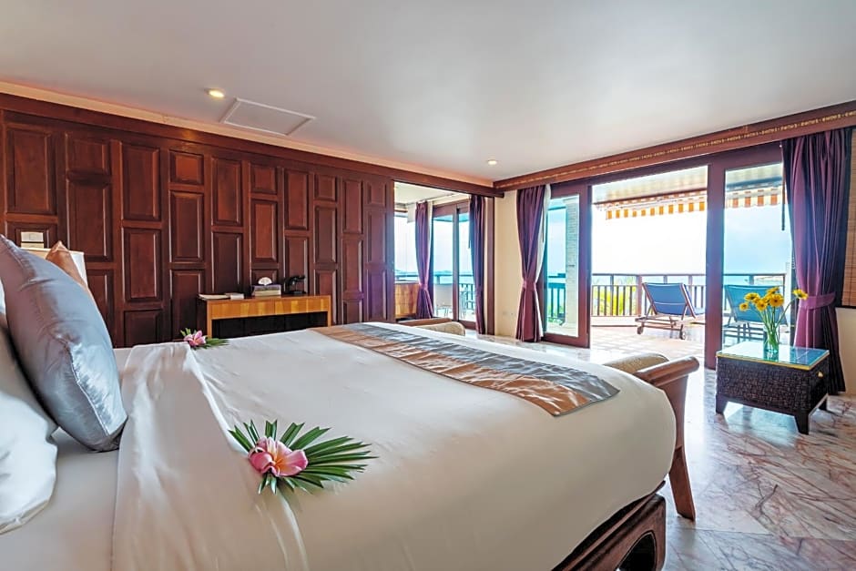 Villa features two sleeping areas and a balcony with 180 degrees ocean view. The main sleeping area features a 42-inch flat screen TV and seating area. The master bath includes a dressing table, a large shower and separate bathtub. The second bedroom area is separated from the main living area by sliding glass doors and has a private half bath. There is a kitchen and outdoor living area with spa bath.
